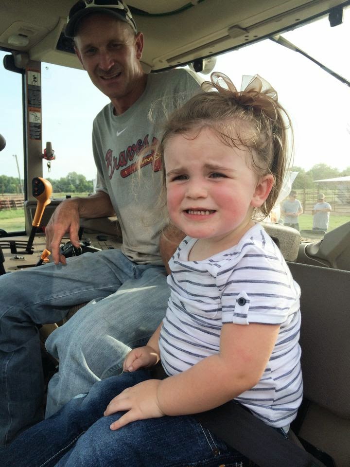 After begging her Papaw for days to ride the tractor, Paisley got to rake and bale hay for a little while on Sunday. She was on cloud nine! I don’t really like her to ride Dad’s tractor that we use to till the roping arena unless it is just to cruise because it doesn’t have an enclosed cab. She thought it was the neatest thing that she had her own seat and everything.
