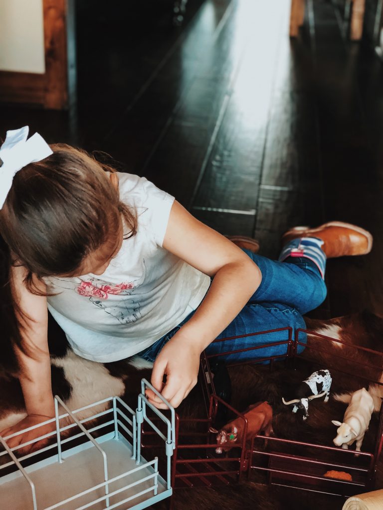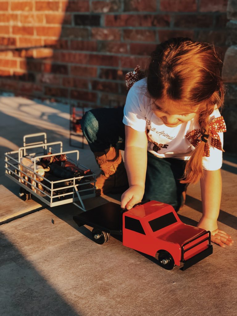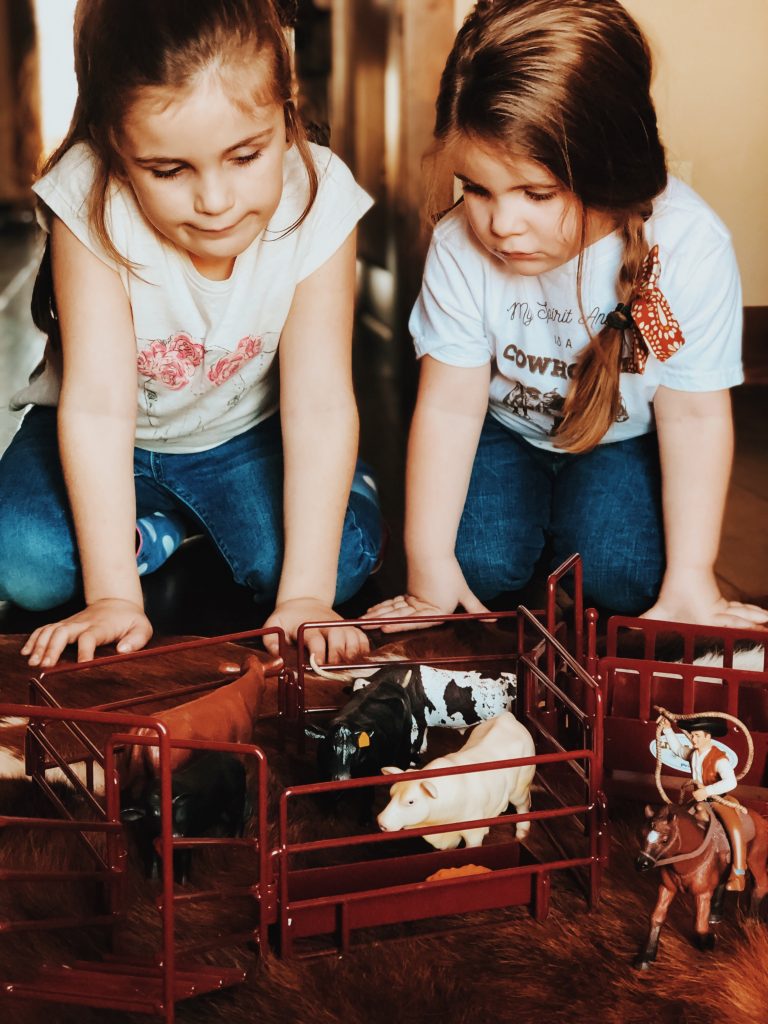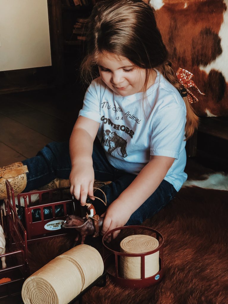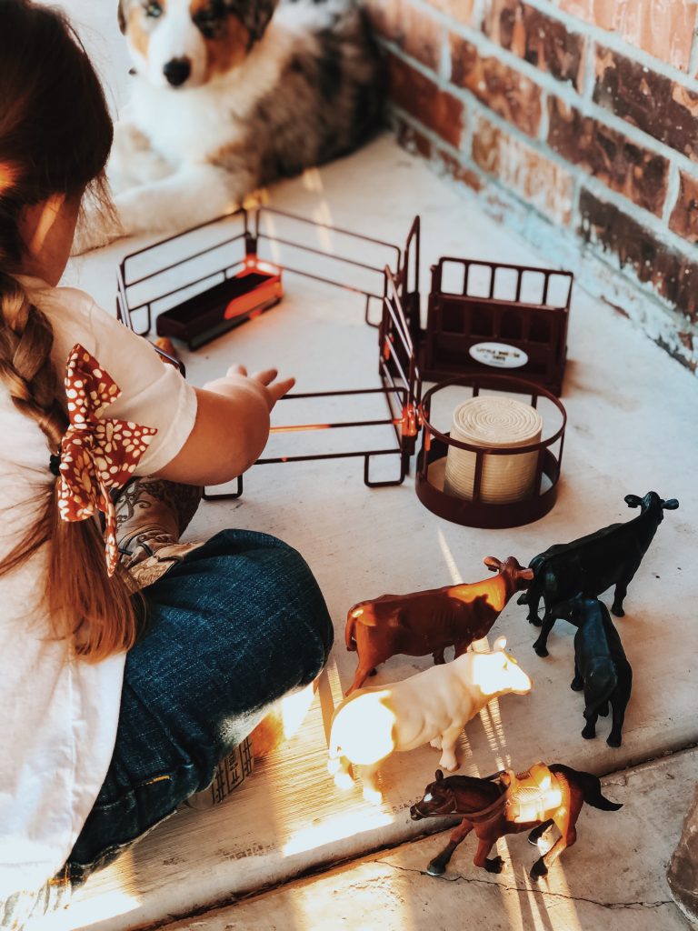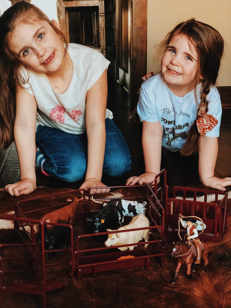 The girls have the best time putting together corrals, hauling hay, shipping and working cattle. Who are we kidding, so do Zack and I! Ha! These toys are absolutely beautiful and we love bringing them outside on pretty days and playing on the ranch with cows mooing in the back ground. Super easy to throw in the girls backpacks and go without worrying about breaking anything.