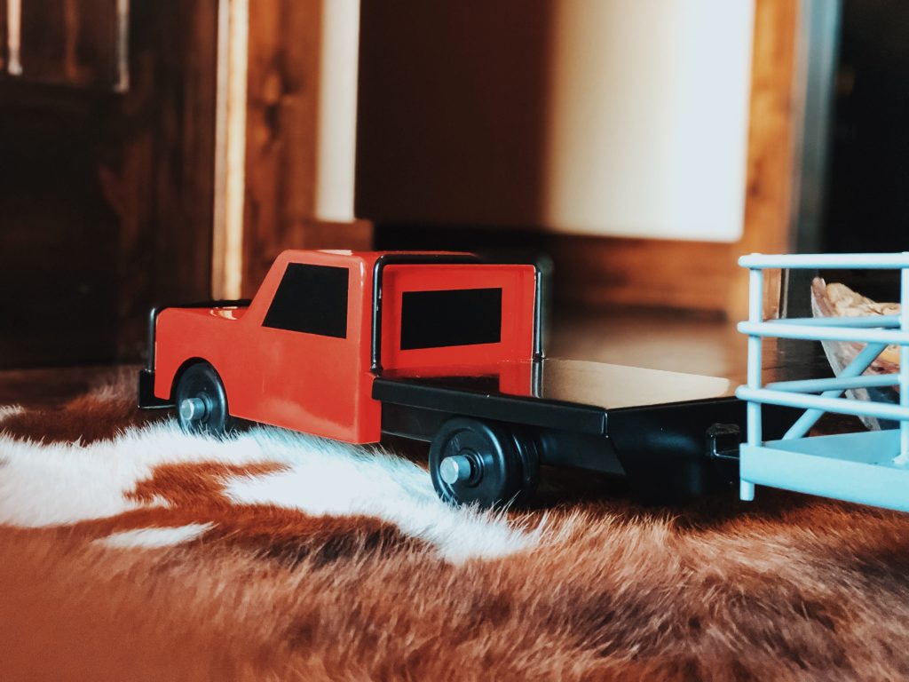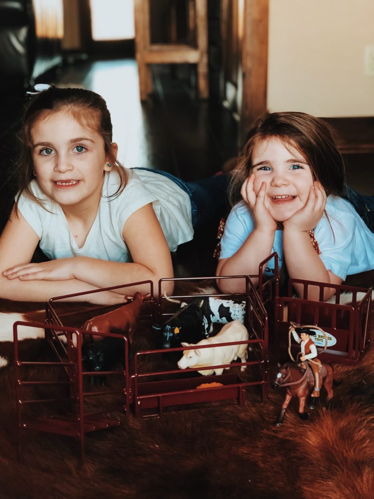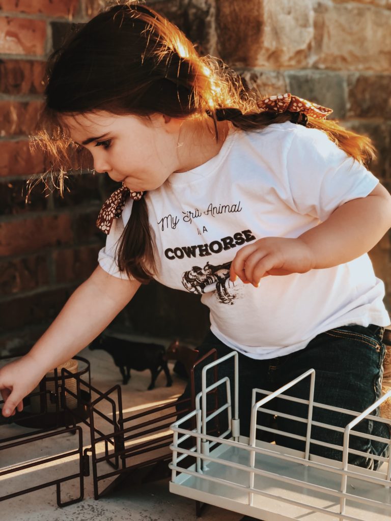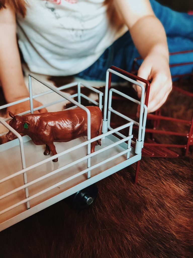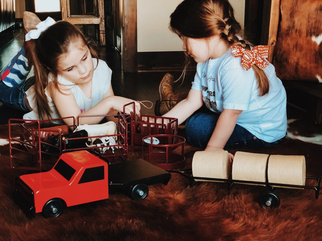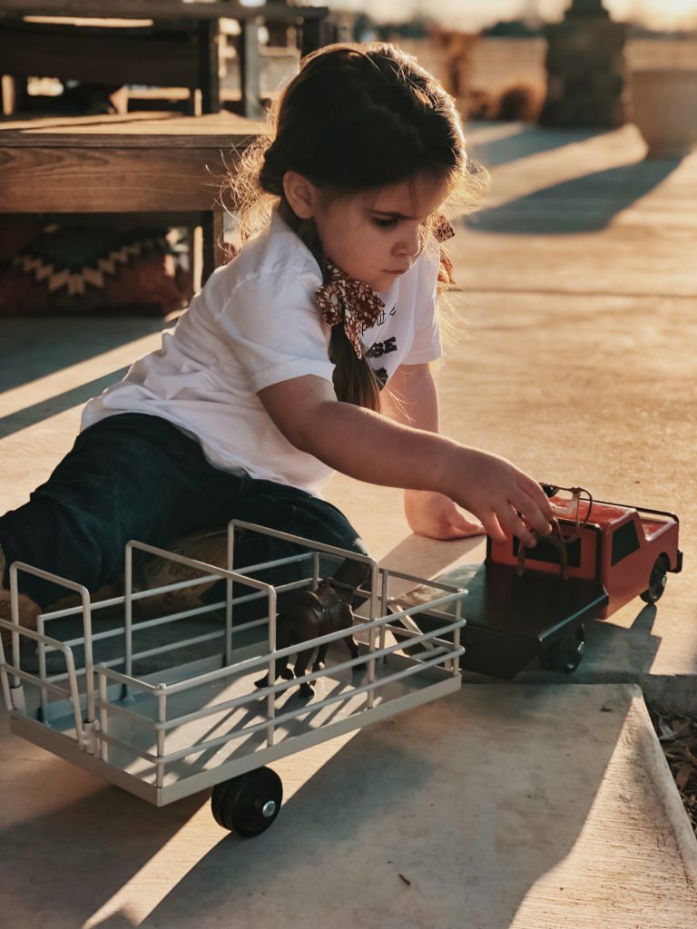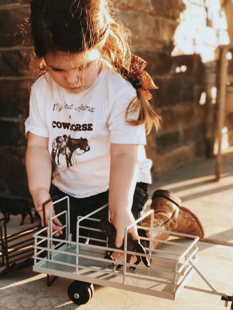 The girls have the best time putting together corrals, hauling hay, shipping and working cattle. Who are we kidding, so do Zack and I! Ha! These toys are absolutely beautiful and we love bringing them outside on pretty days and playing on the ranch with cows mooing in the back ground. Super easy to throw in the girls backpacks and go without worrying about breaking anything.