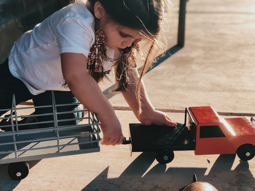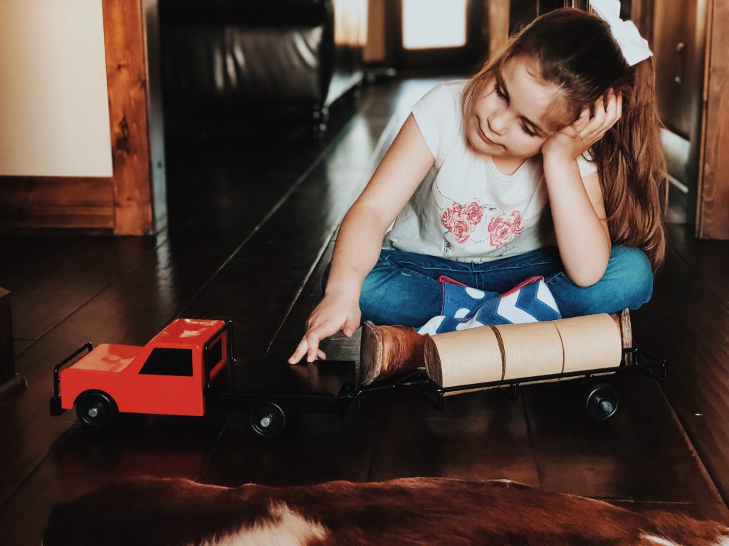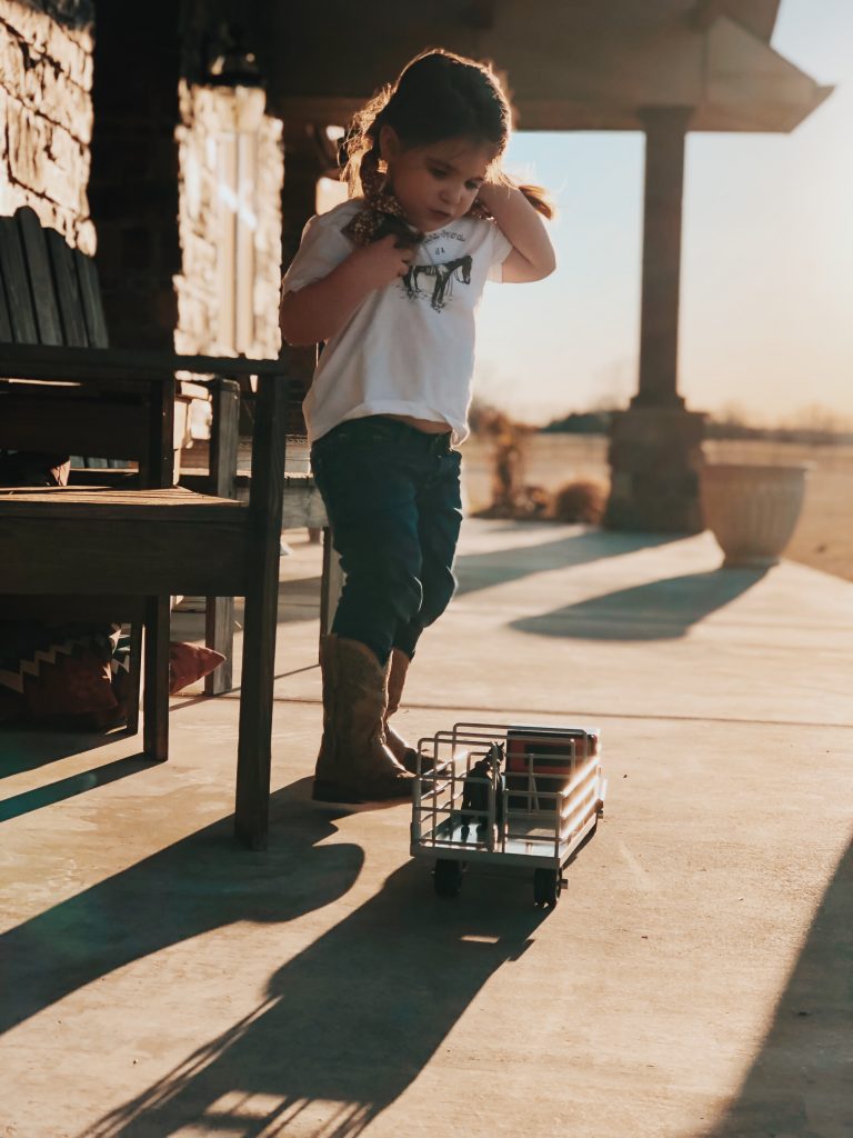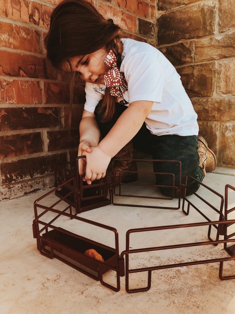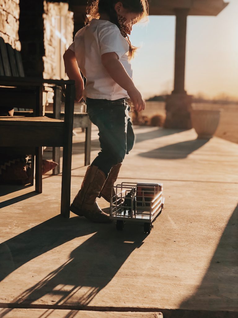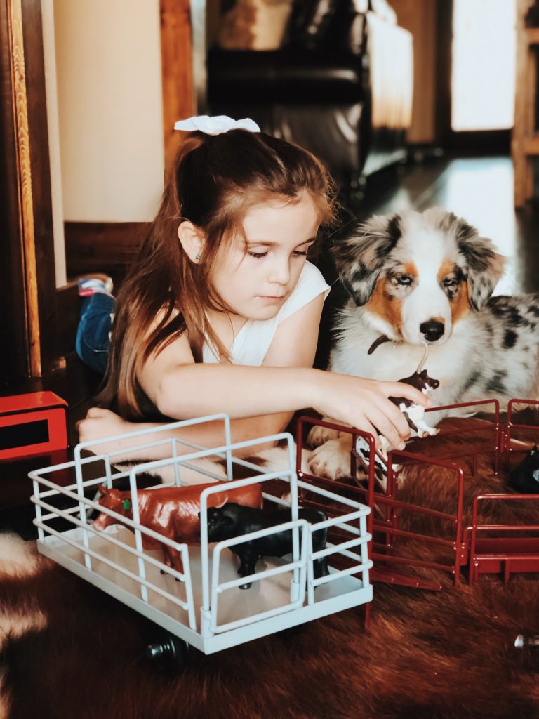 The girls have the best time putting together corrals, hauling hay, shipping and working cattle. Who are we kidding, so do Zack and I! Ha! These toys are absolutely beautiful and we love bringing them outside on pretty days and playing on the ranch with cows mooing in the back ground. Super easy to throw in the girls backpacks and go without worrying about breaking anything.