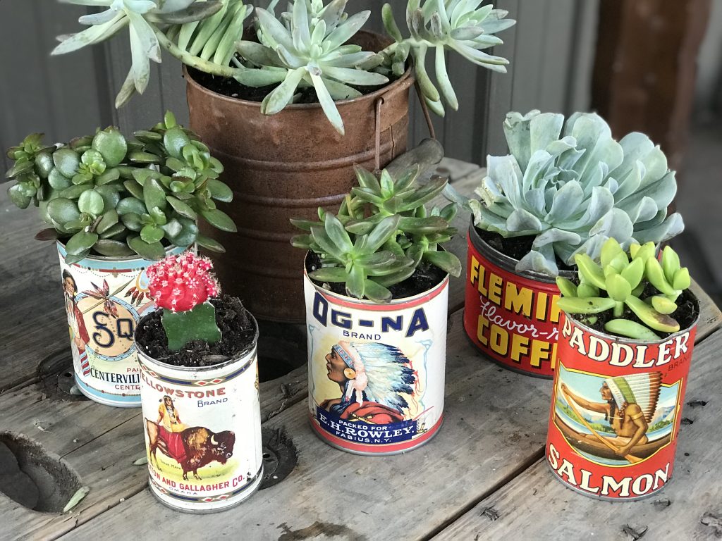 Succulents do not need a lot of root space because they store most of their nutrients and water in their leaves, so don’t let a smaller can be a deterrent. This gives my table a little pop of color and is and adds some decor elements to the porch.