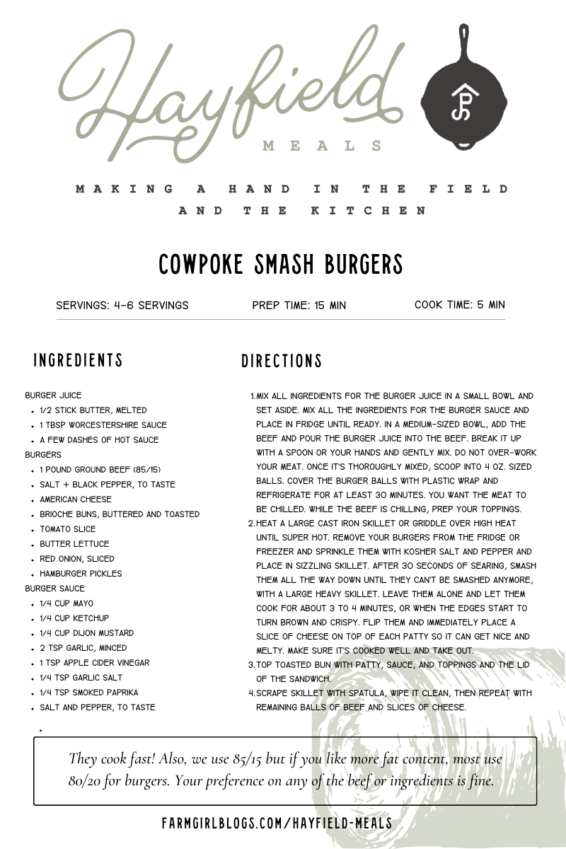 Smash burgers are our favorite on the ranch and this recipe is going to be one of your new favorites. The sauce is absolutely delicious and I don’t think you’ll look at another burger the same. If you have the time, try making your own hamburger buns to really up the quality and flavor. Lean, longhorn beef is what we use.
