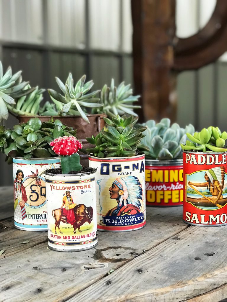 There is just something about summer that makes me want to plant all of the things. I have so much fun dressing up the front porch with various shades of green and love the life it gives to our house. It’s no secret I’m a cactus/succulent lover, and not just because I’m able to keep them alive. I love the different sizes, shapes, and textures. I found these old cans at an antique store two years ago and finally put them to use! I love the unique labels and the big one in the back is just an old coffee can. I normally use terracotta pots for neutral tones to plant in but these were too fun to pass up.
