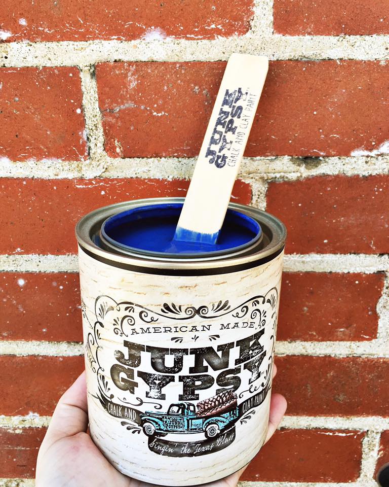 I mixed half Junk Gypsy™ Paint in Singin’ the Texas Blues with half water and 10% volume of downy liquid fabric softener. Half and half just means whatever your paint/water mix volume is. In this case, I used 1 1/2 quarts of paint and 1 1/2 quarts of water. With the paint and water mixture its 96 ounces, so I added a little over 9 ounces of fabric softener. A ‘ballpark’ measurement is fine, it doesn’t have to be exact. I poured it all into a large glass canister and took a paint stick to mix. Over time the paint will settle to the bottom, make sure to stir throughout your project.