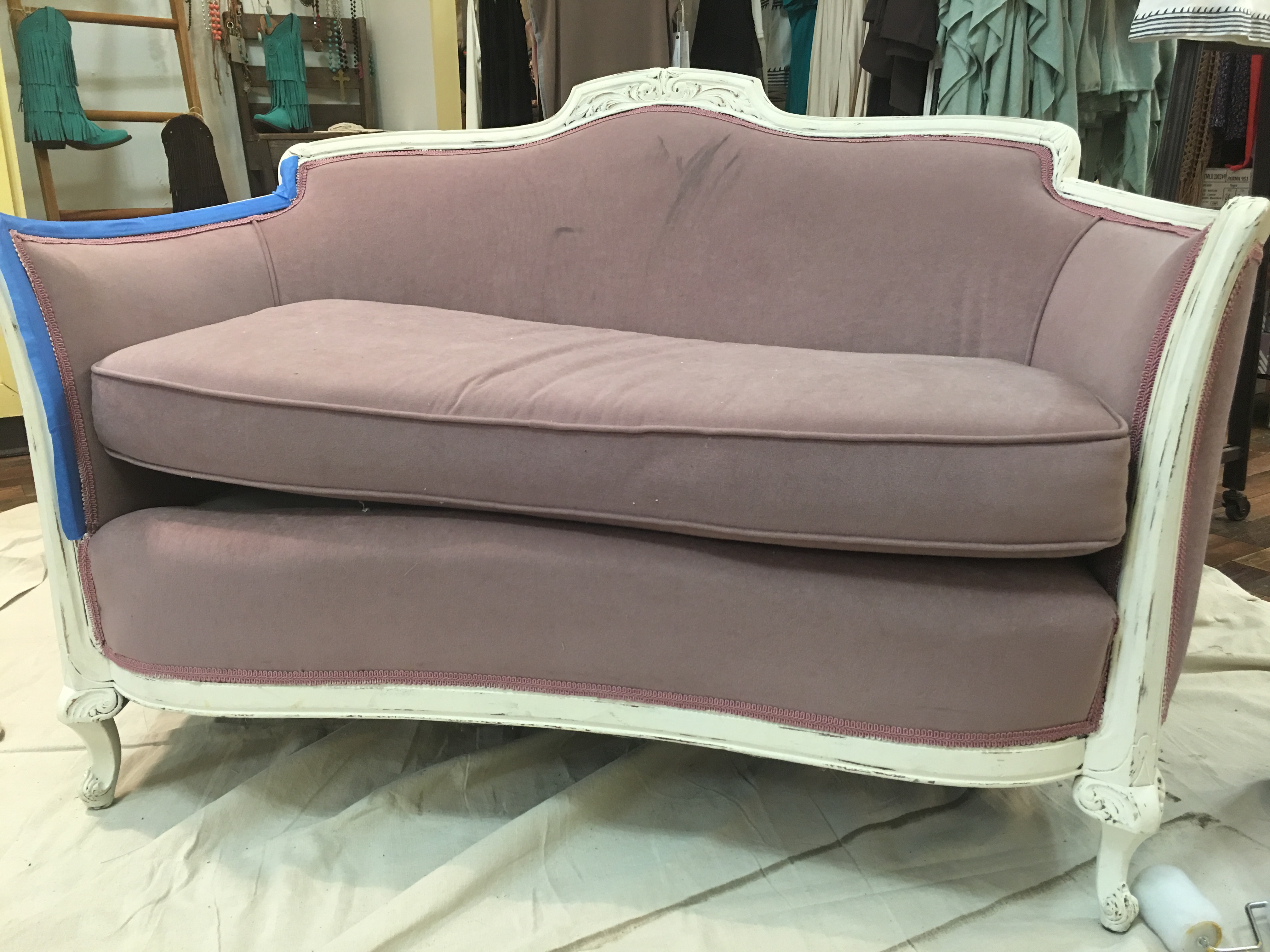 I made sure to really work the paint into the crevices and edging around the wood trim. We recommend a 24-48 hour “cure/dry” time since fabric does soak in the paint. We set up fans around the couch to help it dry.