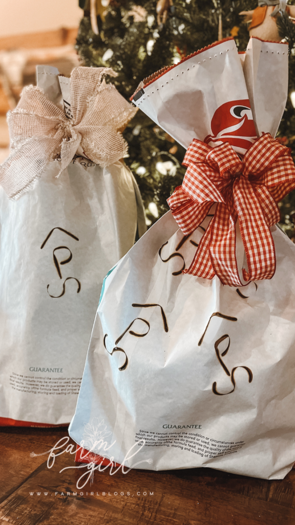 I decided to bring that back this year and talked a little bit about it in our recent Paintbrush Prairie episode. I prefer the plain brown feed sacks but these Shawnee Feeds are still fun too. I took our branding iron to a few, added a bow, and a cute gift tag from Talia’s Etsy shop! These make wrapping odd shaped, bulky packages so easy!